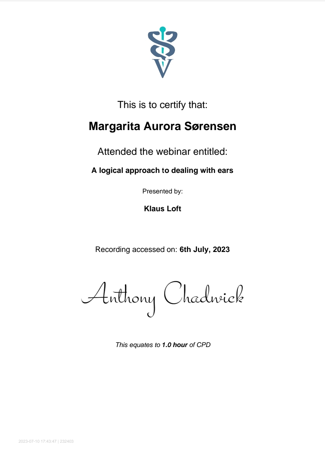 - Fullførte veterinær webinar sertifikater om hundehelse, sykdommer, behandlinger, atferd og mye mer. (Legger ikke til nye sertifikater etter 08.03.24, da det blir så veldig mye bilder)